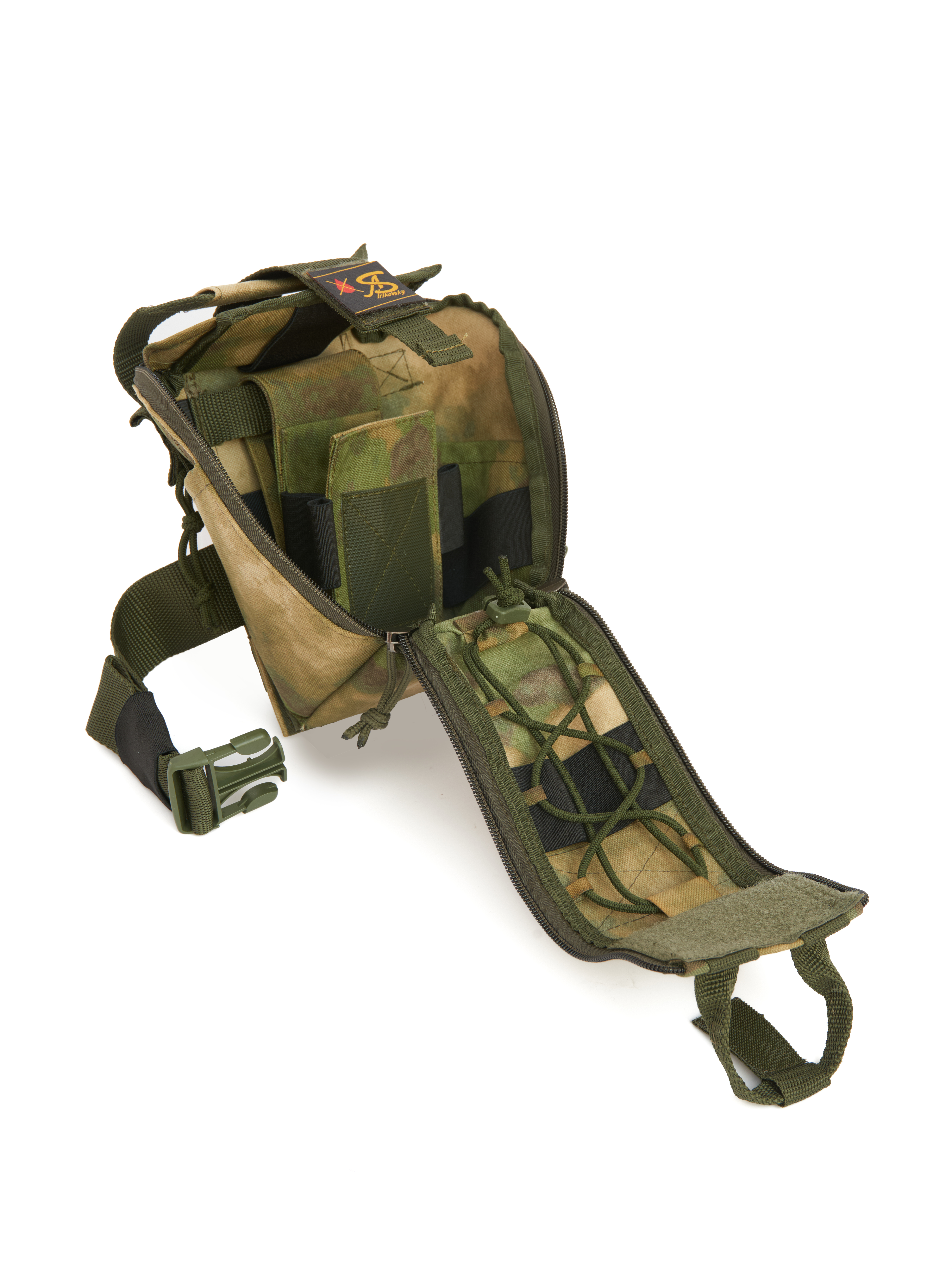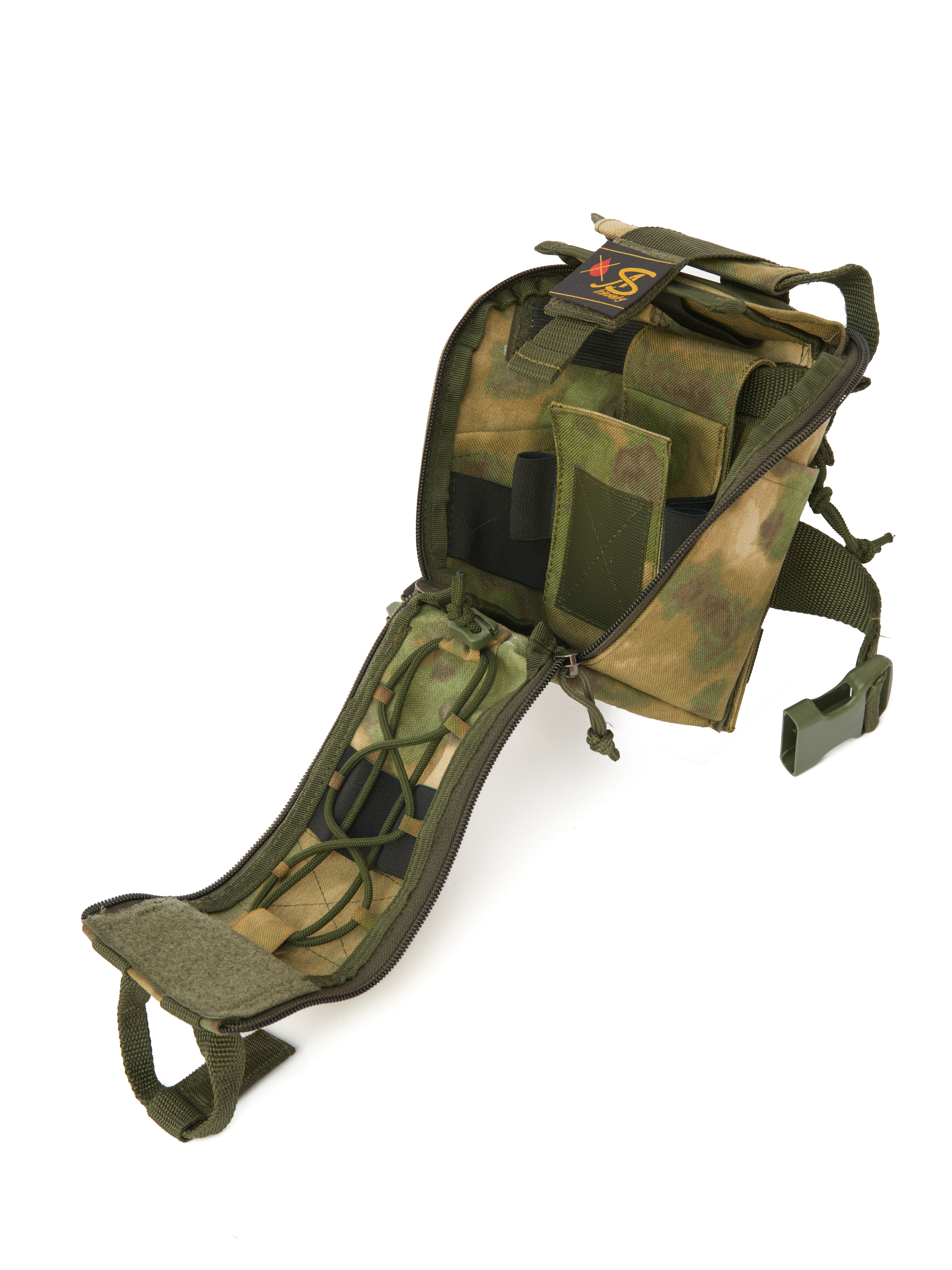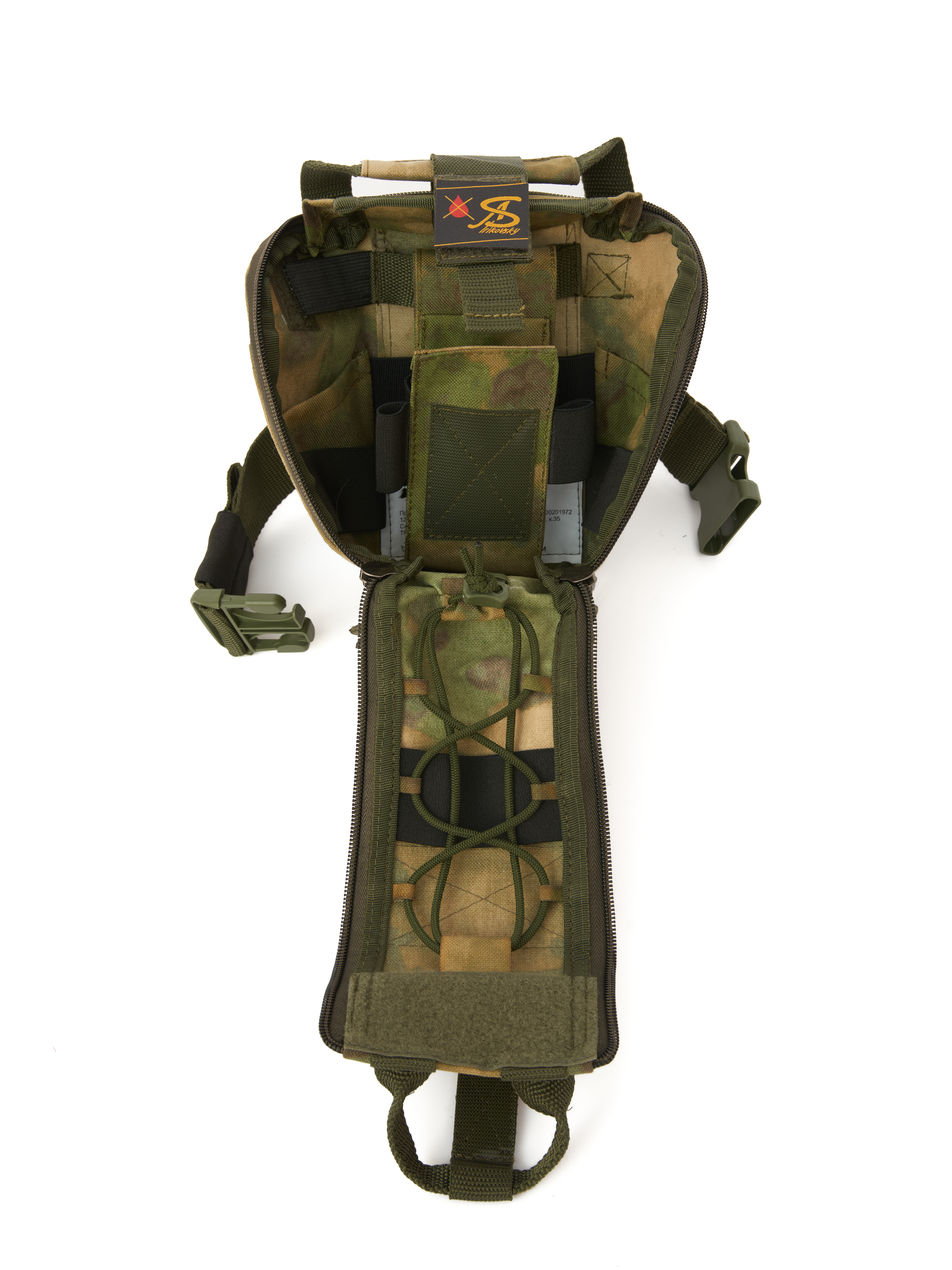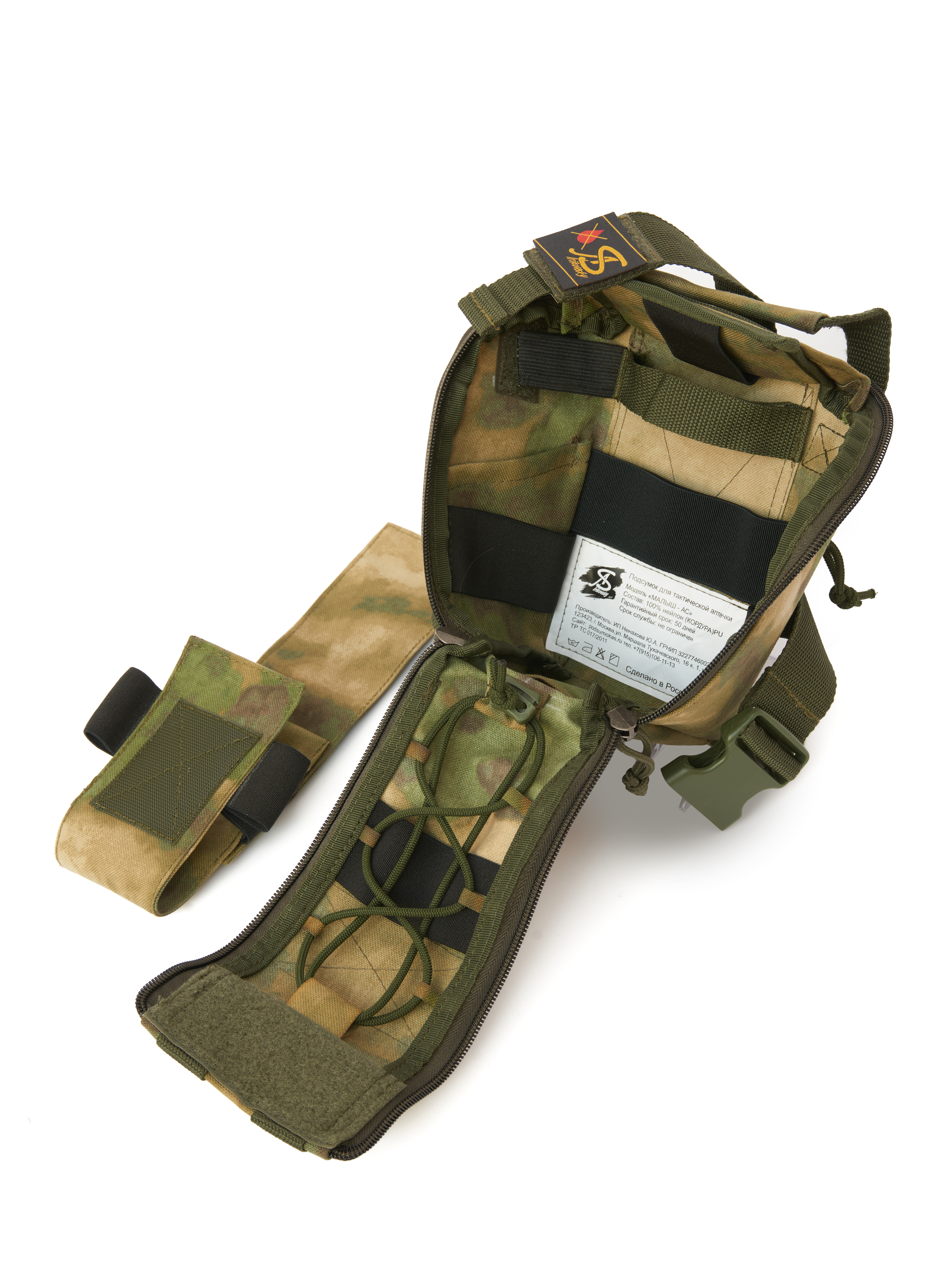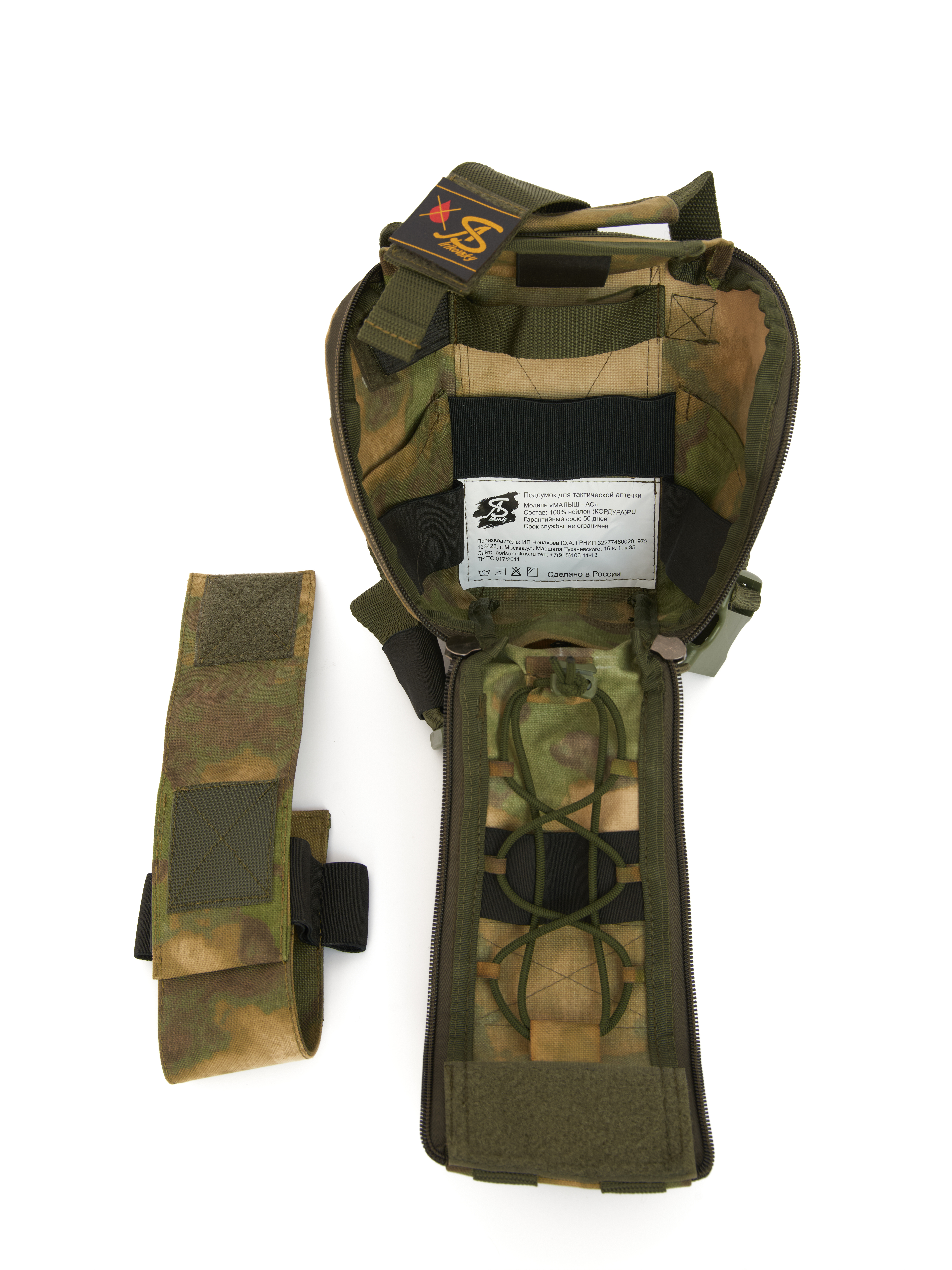 Универсальный подсумок "МАЛЫШ-АС" отрывного типа, идеально подходит для аптечек как 1-го так и 2-го эшелона. Оснащен жгуто-укладчиком (инновационным приспособлением для мгновенного применения турникетов и жгутов без лишних действий одной рукой).  Он позволяет разместить турникеты в полностью готовом к применению состоянии, что критически важно для своевременной остановки массированных кровотечений.