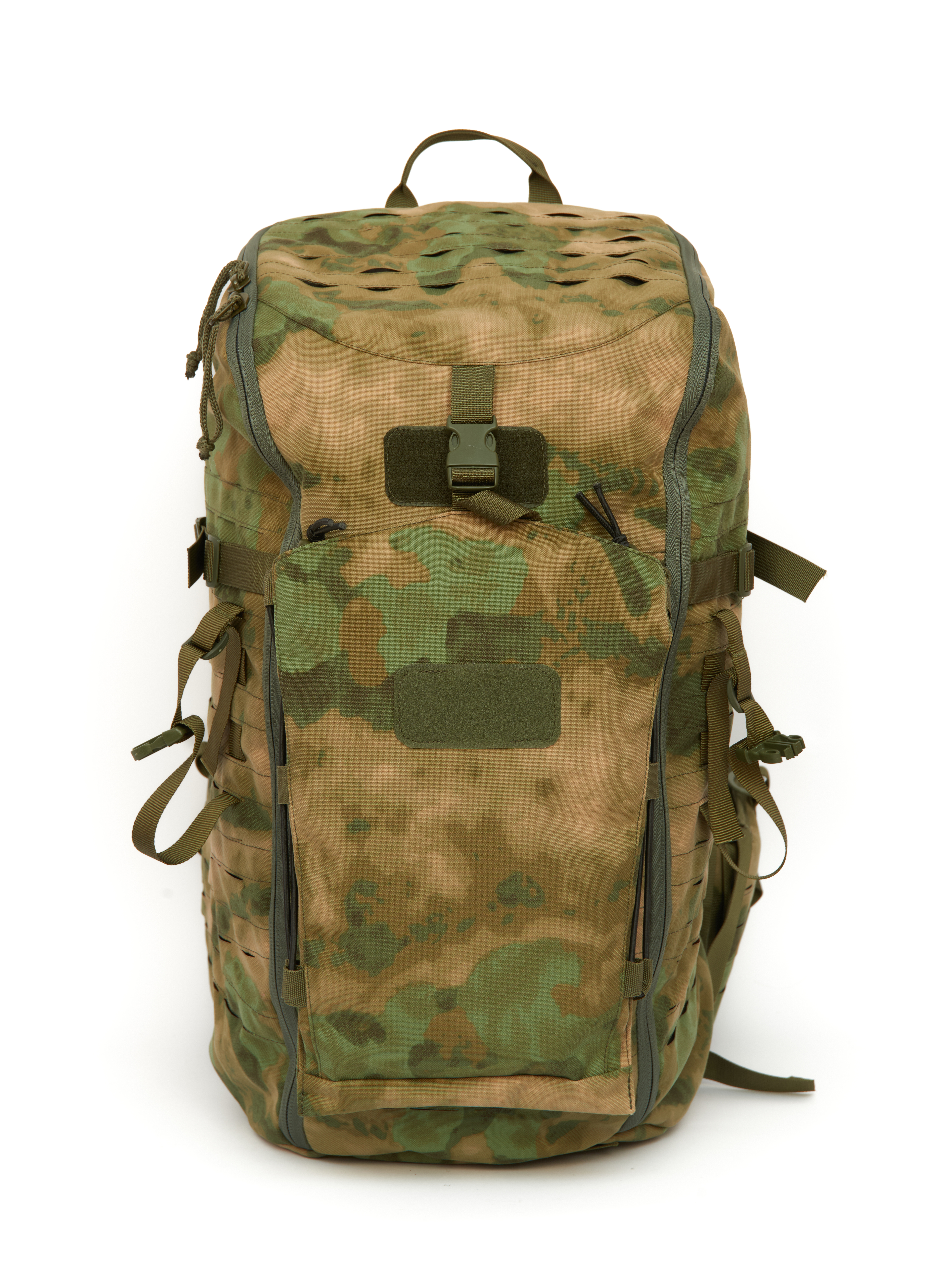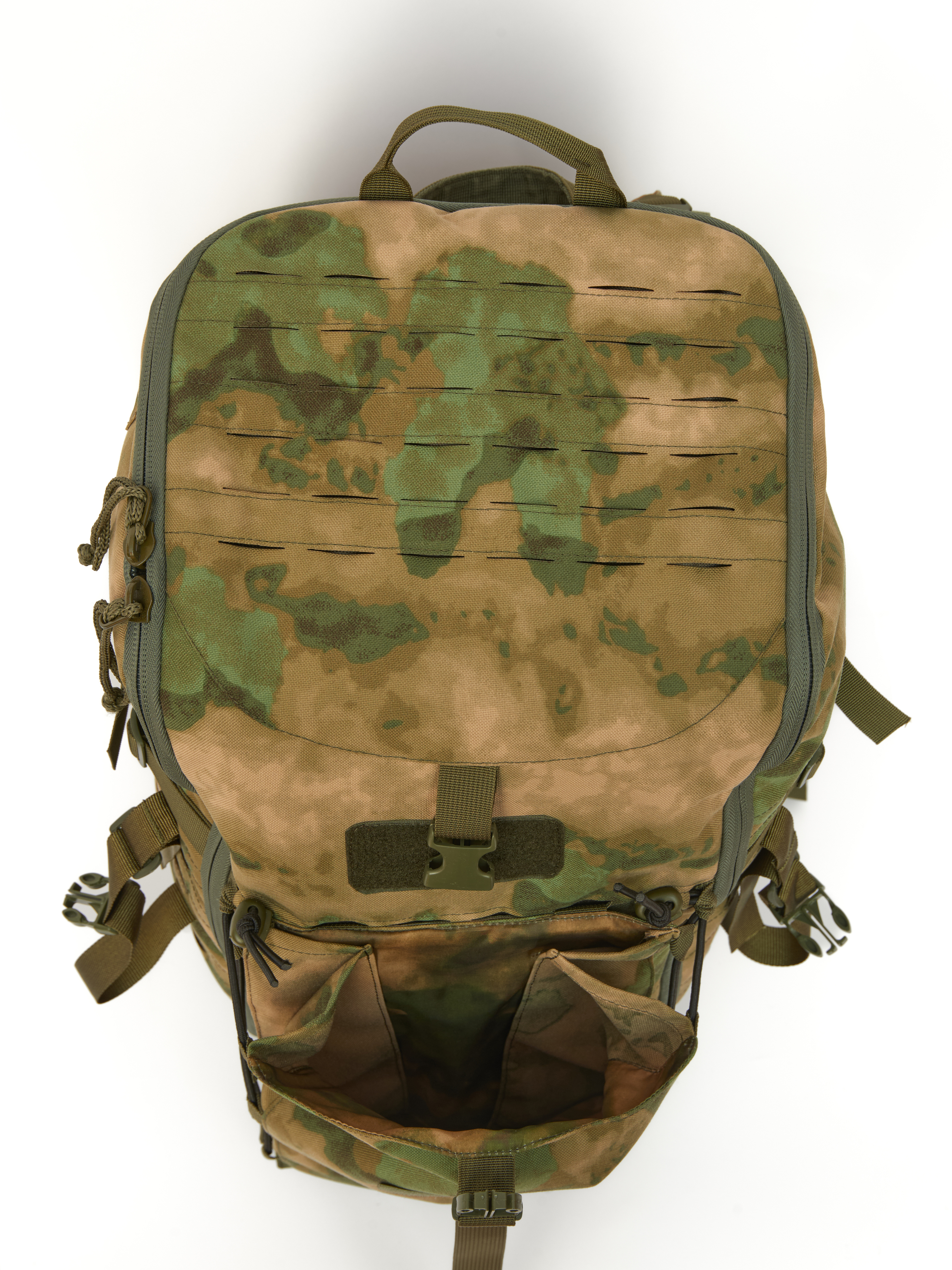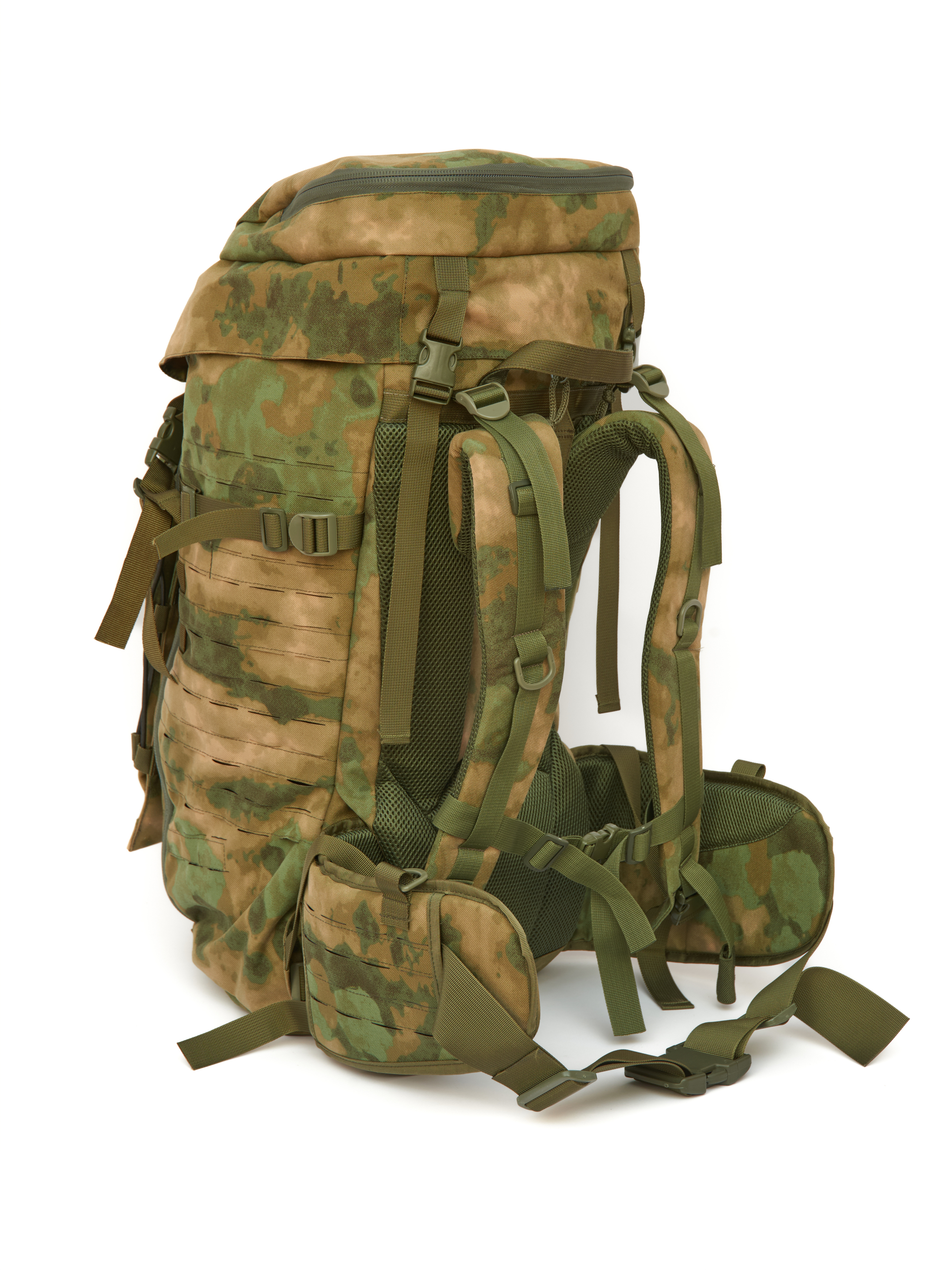 На боковых и фронтальной поверхности система MOLLE минус, выполненная лазерной резкой и дополнительно усиллена стропой. Что позволяет крепить к рюкзаку дополнительные подсумки и снаряжение.