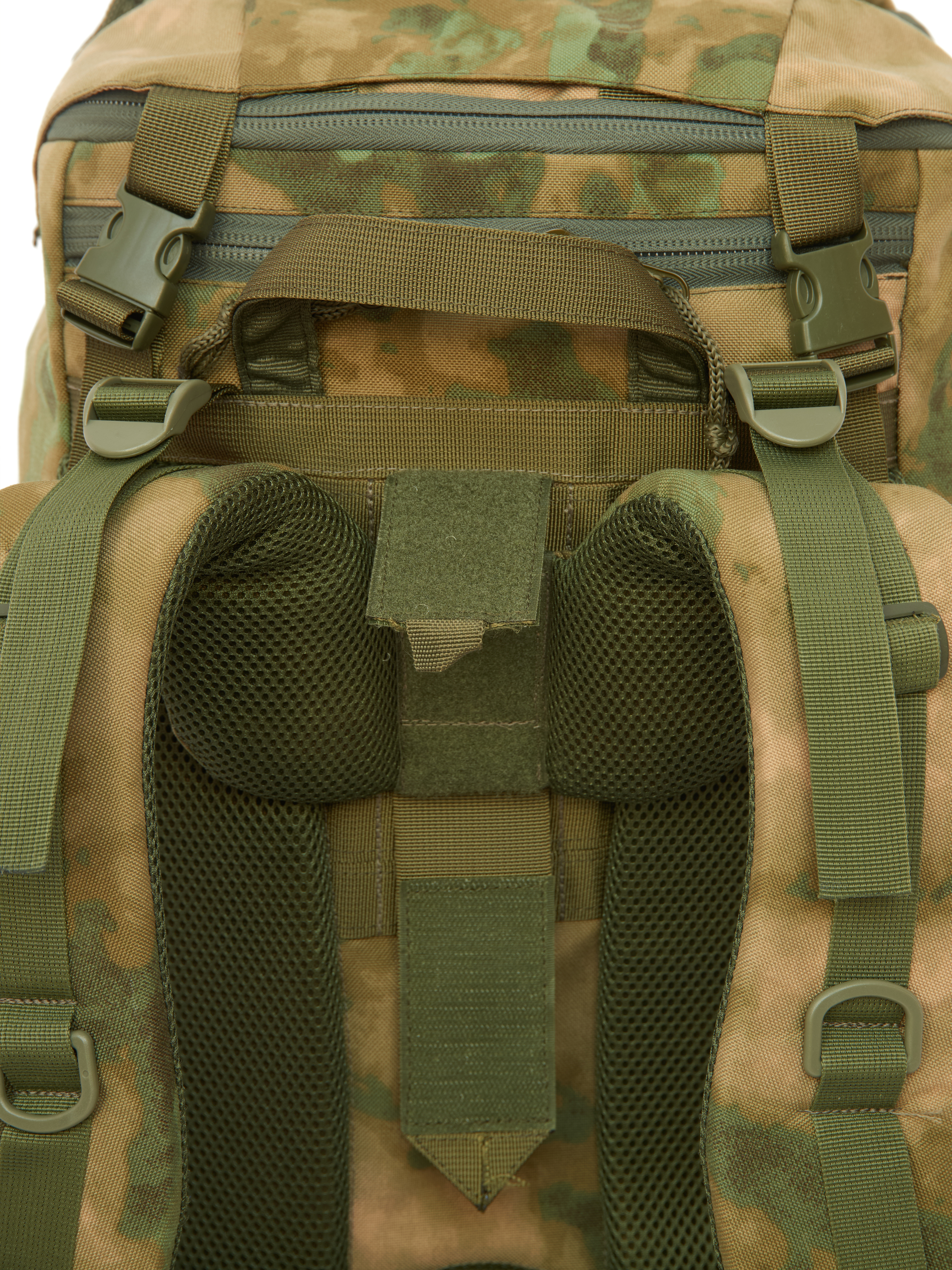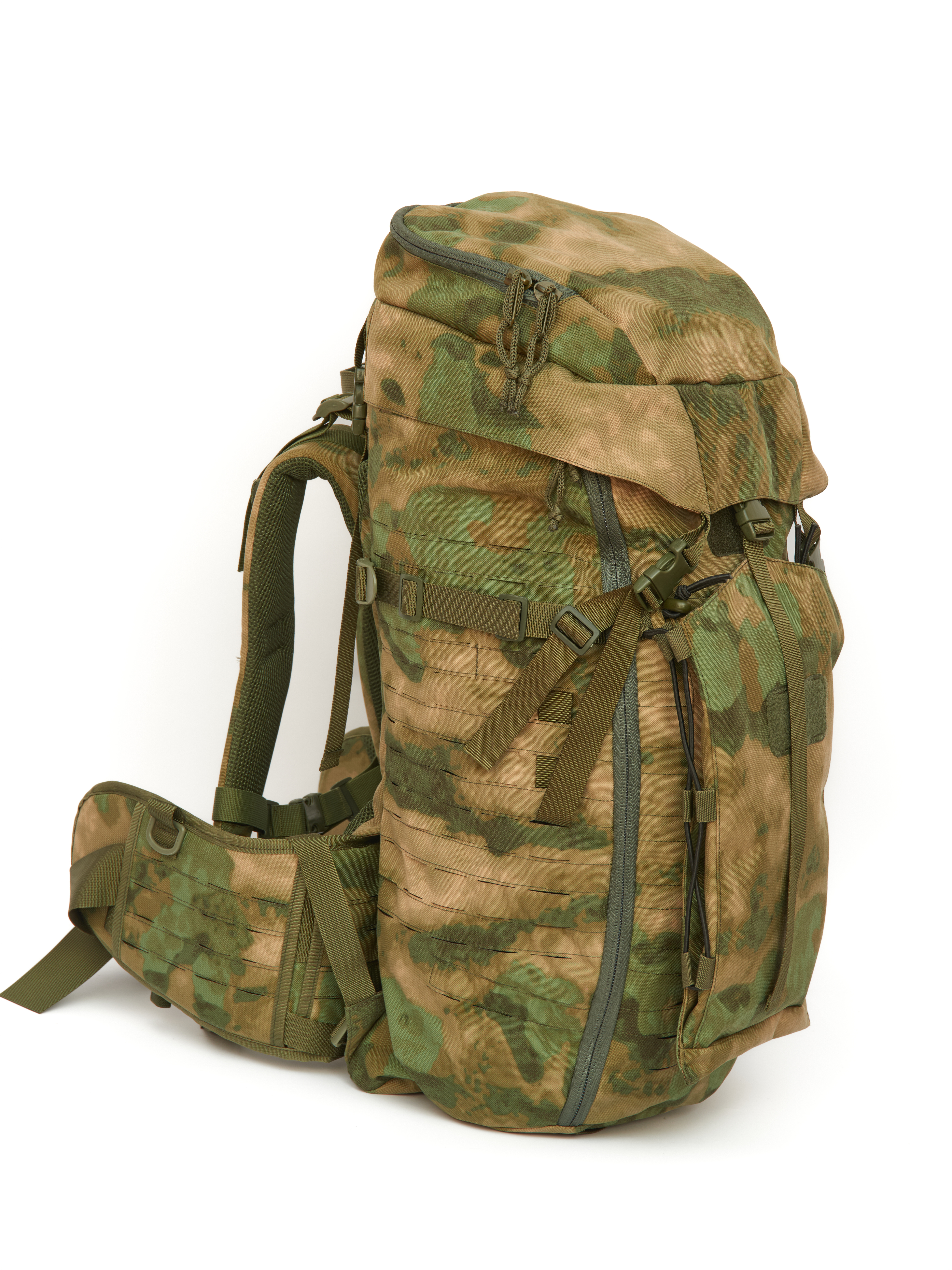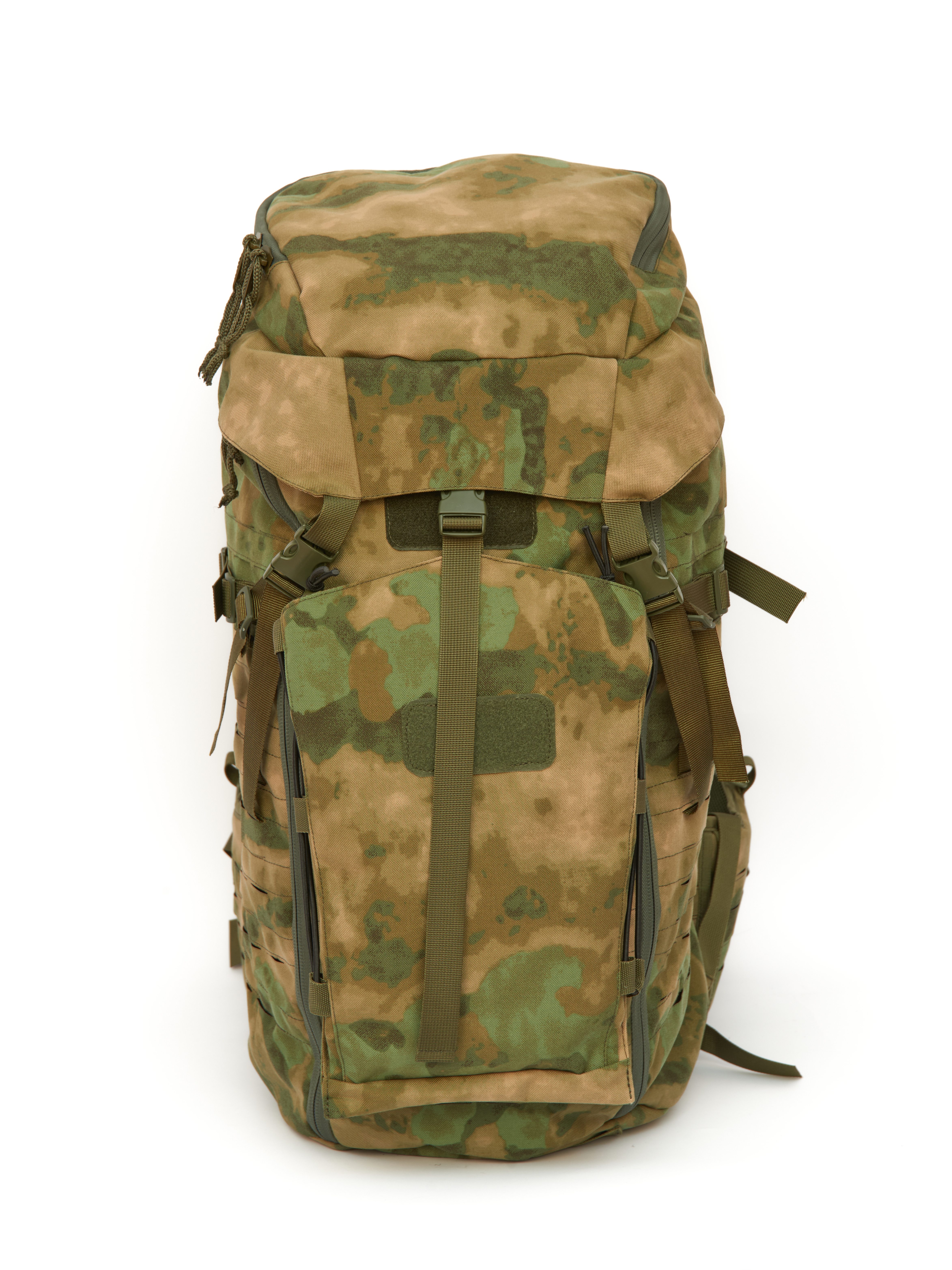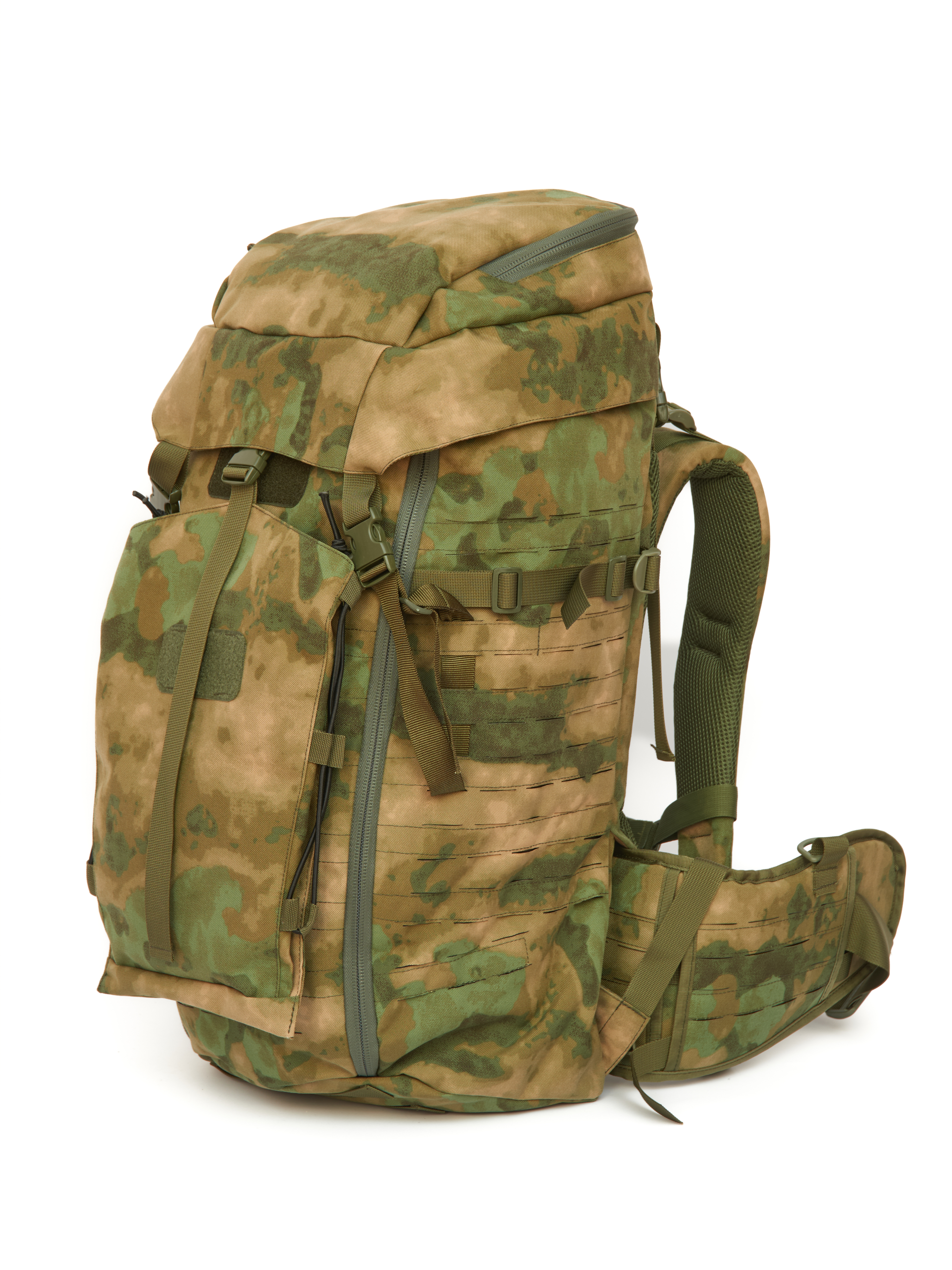 На боковых и фронтальной поверхности система MOLLE минус, выполненная лазерной резкой и дополнительно усиллена стропой. Что позволяет крепить к рюкзаку дополнительные подсумки и снаряжение.